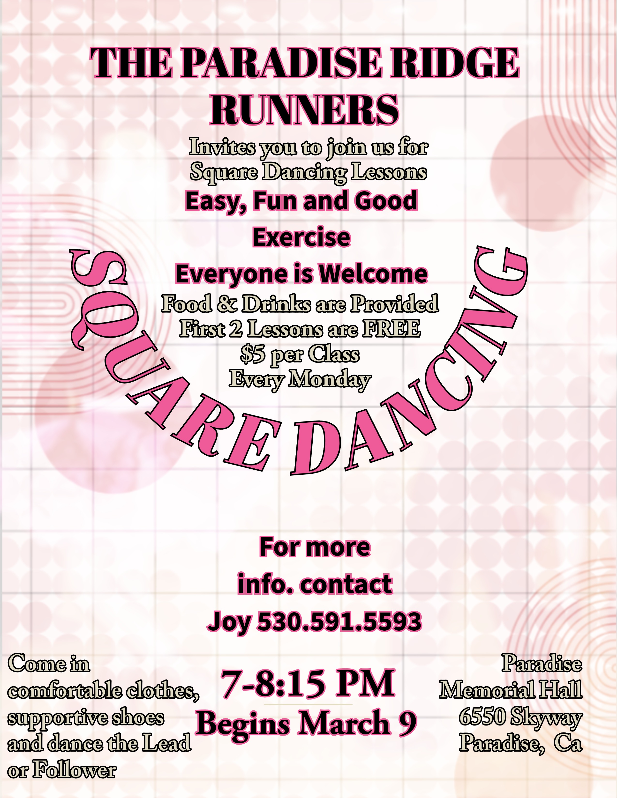 The Paradise Ridge Runners square dance group meets in Paradise, California. Check back here often for information about dances, classes, and events.
